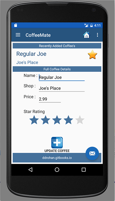Before you get to actually update the coffee on the server, it's probably worth testing your app at this point to see if everything is working correctly, so run your app and confirm you get to see the coffee details on the Edit Screen once the user has selected a particular coffee to edit, like so